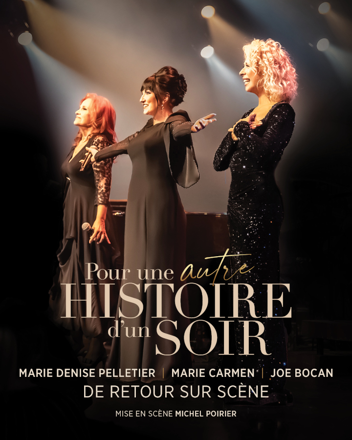 Productions Martin Leclerc/Groupe Juste pour divertir sont fiers d’annoncer ce soir en primeur que trois des plus belles voix du Québec, Joe Bocan, Marie Carmen et Marie Denise Pelletier, se retrouveront de nouveau ensemble sur scène, avec Pour une autre histoire d’un soir, une version revisitée du spectacle qui leur a valu le Félix du Spectacle de l’année Variétés/Réinterprétations en 2022 et un Billet d’or pour plus de 50,000 spectateurs conquis.