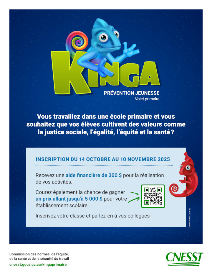 La Commission des normes, de l’équité, de la santé et de la sécurité du travail (CNESST) devance les inscriptions et bonifie le contenu du programme éducatif Kinga, prévention jeunesse. Pour cette nouvelle édition, une activité consacrée aux risques psychosociaux liés au travail a été ajoutée pour les jeunes du secondaire. De plus, l’inscription est devancée pour mieux s’arrimer au calendrier scolaire, ce qui laisse plus de temps au personnel enseignant pour réaliser leurs projets.