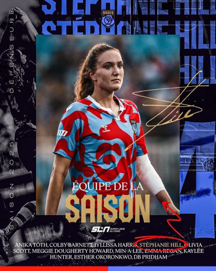 Les Roses de Montréal sont fières d’annoncer que la défenseure Stéphanie Hill a été sélectionnée dans l’Équipe de la saison de la Super Ligue du Nord (SLN), une distinction votée par les joueuses de la ligue.